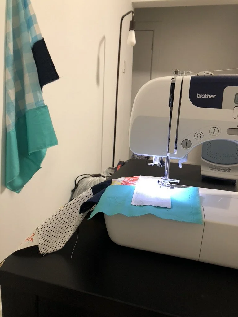 Because the hand-stitching was taking forever, i decided to finish this off with stitching, 1/4” apart in spacing. I would sew about 10 line with longer stitches, and then the next 10 stitches with a tighter stitch, correlating with the gingham patt